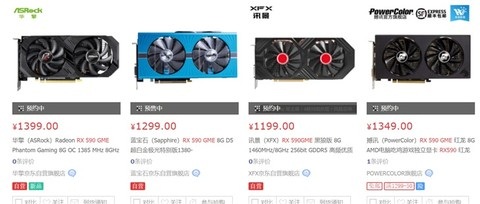 京东官网消息,目前已经有四家厂商推出了新型号显卡,分别是XFX RX 590GME黑狼版 8G、华擎Radeon RX 590 GME Phantom Gaming 8G OC、蓝宝石RX 590 GME 8G D5和撼讯RX 590 GME 红龙 8G。