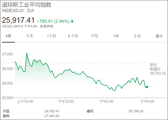 截止周二收盘,美国三大股指大幅下跌,道指收盘下跌785.91点,或2.94%,报25917.41点;纳指跌268.07点,或2.99%,报8684.09点;标普500指数跌86.86点,或2.81%,报3003.37点。