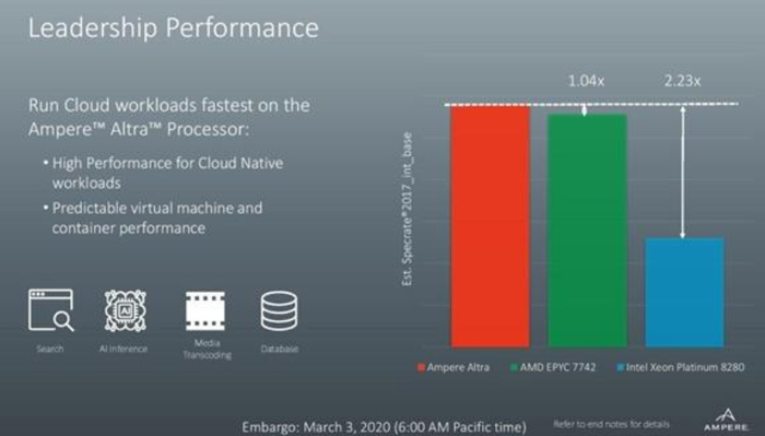Ampere Altra的功耗为210瓦,其目标服务器应用包括数据分析、人工智能、数据库、数据存储、电信堆栈、边缘计算等。