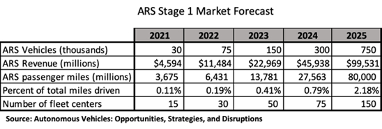 预计到2021年将有30,000辆自动驾驶服务车辆,产生超过45亿美元的收入。每辆ARS车辆每年预计可产生约150,000美元的收入,基于每天有50次付费旅行,每次旅行约8.75美元,一年运营350天。