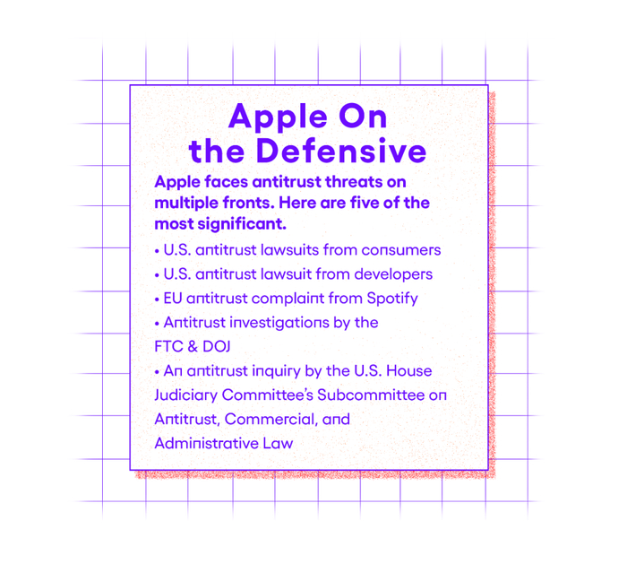 苹果面临着来自消费者、开发商提出的反垄断诉讼,面临着Spotify向欧盟提出的正式反垄断投诉,面临着联邦贸易委员会(FTC)和美国司法部的反垄断调查,以及美国众议院反垄断小组委员会的调查。这不仅关系到苹果的利润,也关系到移动软件的未来。