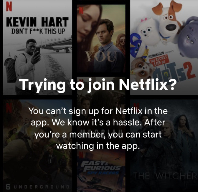 上面写着:“想要加入Netflix吗?你不能在应用程序中注册Netflix。我们知道这很麻烦。在你成为会员之后,你就可以开始在应用程序中观看节目了。”令人感到奇怪的是,如果你想注册Netflix,它却没有进一步说明如何注册或去哪里注册:没有URL,没有二维码,甚至没有如何加入的提示。如果你还不是会员,到这里就“game over”了。