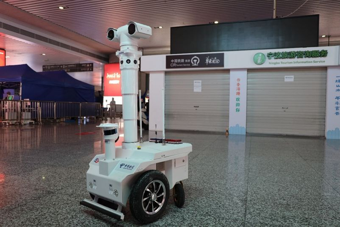 宁波火车南站上岗的5G测温巡逻机器人