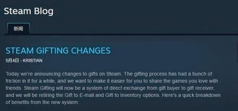 2017年5月Steam更改平台机制,玩家无法再将游戏打包存入个人库存中,尽管送礼物机制仍在但是玩家只能在商店页面直接送即时礼物,接收礼物的玩家游戏直接入游戏库无法囤积!