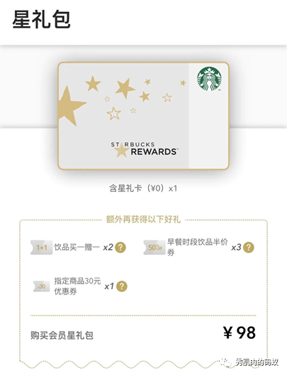 店员:98元,并且一旦你在星巴克APP中绑定这张星礼包,你马上就可以升级为玉星级会员,玉星级会员还会赠送你3张咖啡券。