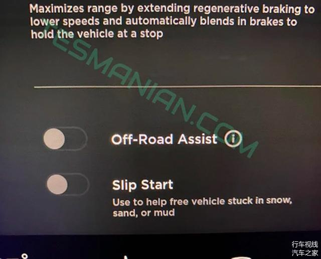 另外,Model Y作为SUV车型,相较于全轮驱动版的Model 3车型增加了越野辅助功能,驾驶者可以通过系统设置菜单中激活这一功能。官方对这一功能的备注为:“通过牵引力控制优化越野性能。启动越野辅助后,某些自动驾驶安全功能,如自动紧急制动和车道保持功能将不可用。”