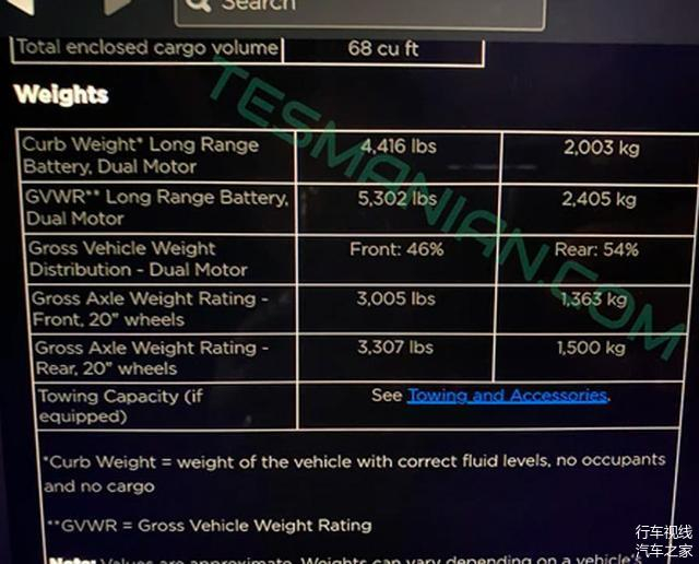除尺寸信息外,我们还获取到Model Y车型的整备质量信息,随着车身增大,Model Y的整备质量也较Model 3有明显增加,其中Model Y四驱长续航版车型的整备质量达到2003kg。此外,Model Y的前轮配重为46%,后轮则为54%。