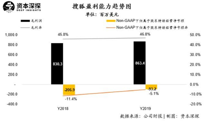 一直以来,张朝阳都在各个公开场合表示搜狐即将盈利,但这句预言始终未能兑现。如今单季度实现盈利,全年亏损收窄,搜狐2019年全年取得营业收入18.45亿美元,较2018年同比增长1.8%;Non-GAAP下归属于股东持续经营净亏损9320万美元,相比较2018年净亏损2.07亿美元,大幅减少54.9%。同时,公司2019年净亏损率收窄为-5.1%,相比2018年下降6.4个百分点。