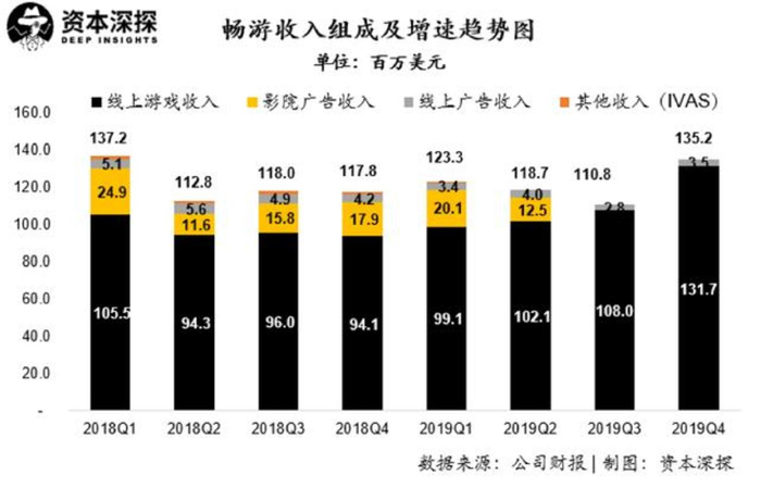而游戏收入之外的在线广告收入以及IVAS收入则均呈现下降趋势。而上海晶茂则由于长期经营亏损、资不抵债在2019年宣布破产,畅游的院线映前广告业务也宣告终止。