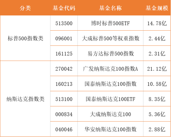博时标普500ETF和它的连接基金;广发纳斯达克100指数、国泰纳斯达克100。
