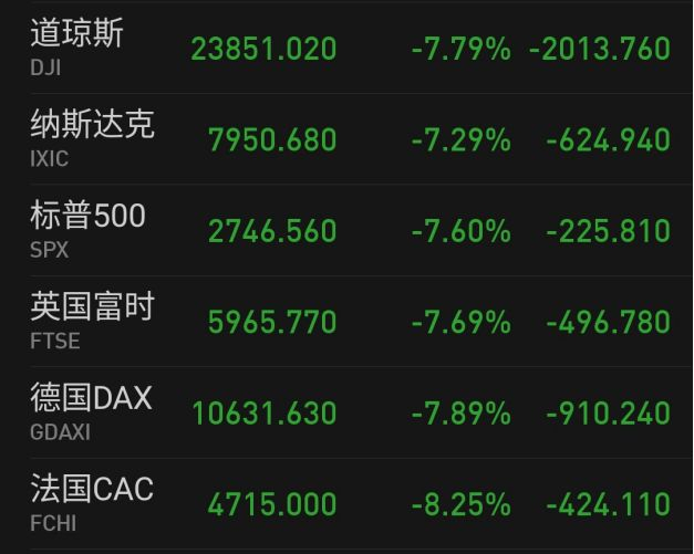 emmm,真的跌的好惨。道琼斯指数,一晚上没了2000点。道指、纳斯达克指数、标普500指数,跌幅都在7%以上。欧洲3个带头大哥,英国、德国、法国,跌幅近8%。