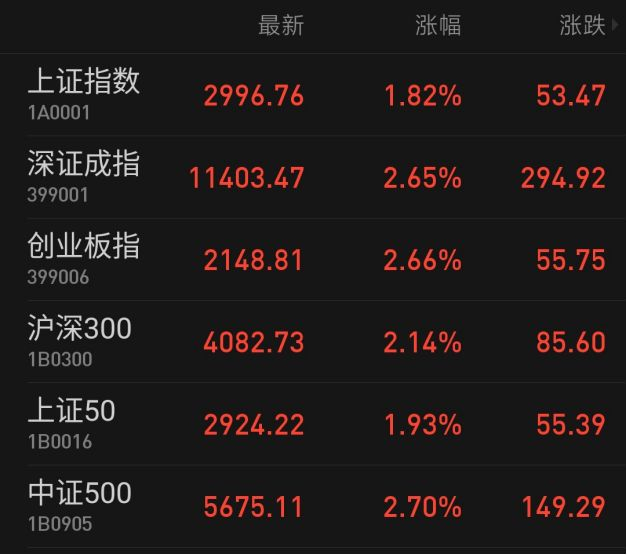 截止下午收盘,上证50指数上涨了1.93%;沪深300指数上涨2.14%;中证500指数,上涨2.7%。