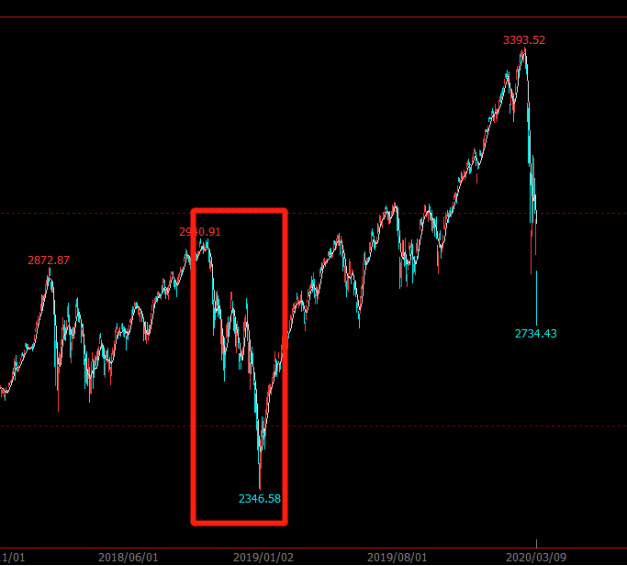 我们以标普500指数为例,不到1个月的时间里,指数从3390点跌到2734点,指数大跌了18%。