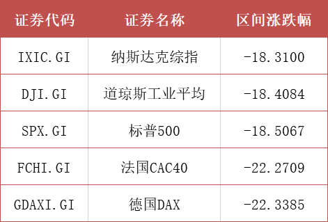 同期的纳斯达克指数、道琼斯指数,其实跌幅差不多。三个指数都是在不到1个月里,大跌了18%。欧洲“三傻”的德国、法国、英国,平均跌幅22.3%。