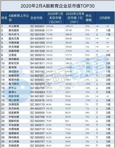 2月教育企业市值排行榜:涨幅TOP 10企业均涉及在线教育业务