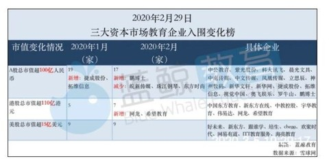 下面是2020年1月31日至2020年2月29日,三大资本市场教育企业入围变化表,像以往一样,蓝鲸教育智库分别按照A股100亿人民币,港股110亿港元,美股15亿美元为分水岭观察,梳理出如下三大资本市场教育企业入围的变化情况: