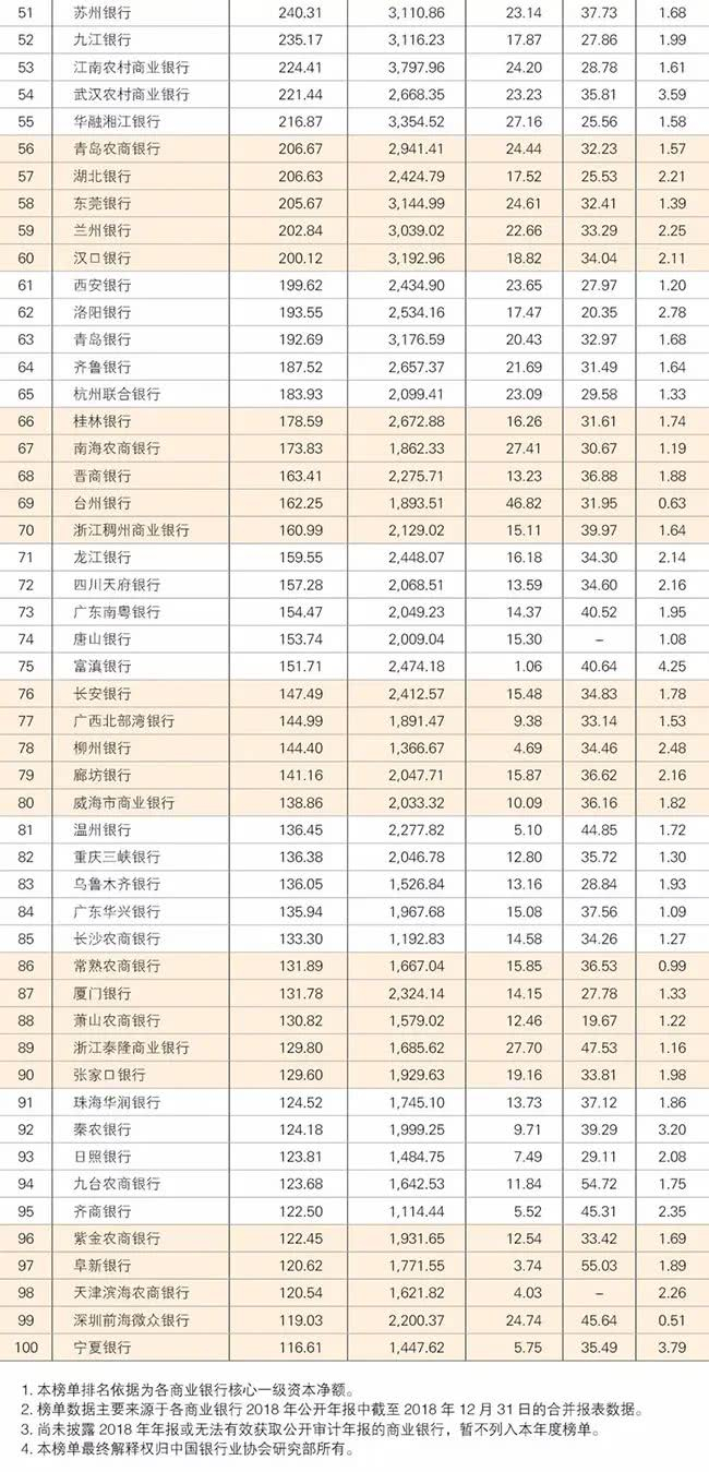 从核心一级资本净额排名上升位次来看,甘肃银行提升19位,威海市商业银行提升18位,江西银行提升15位,台州银行、广西北部湾银行提升13位,广州银行、长沙银行及湖北银行提升12位,九江银行提升10位,武汉农商银行、青岛农商银行及南海农商银行均提升9位。值得一提的是,三家城商行——柳州银行、浙江泰隆商业银行以及珠海华润银行,两家农商行——常熟农商银行、紫金农商银行均首次入围榜单,深圳前海微众银行作为最早成立的民营银行之一,率先进入百强榜单,位列第99位。