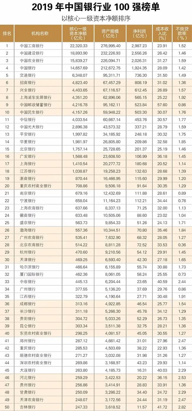 核心一级资本具有最强的损失吸收能力,是反映银行风险抵补能力的重要指标,也是银行经营发展的重要基础。榜单选用核心一级资本净额作为排序依据,并附加资产规模、净利润、成本收入比、不良贷款率等数据作为参考,具有充分的理论和现实意义。在此次抗击疫情中,充足的资本状况为银行业金融机构支持疫情防控和助力经济发展提供了坚实的基础。