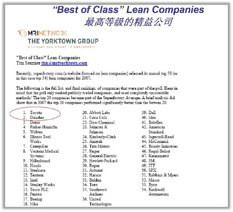 目前,丹纳赫的精益管理能力在西方企业中排名第一,全球排名第二,仅次于日本的丰田汽车。
