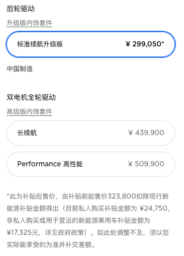答:目前Model 3的指导价为32.38-50.99万元,总3款车型,分别为标准续航升级版、长续航与Performance高性能版。其中在国内国产的车型是售价32.38万元的标准续航升级版,在补贴后售价降至29.91万元。