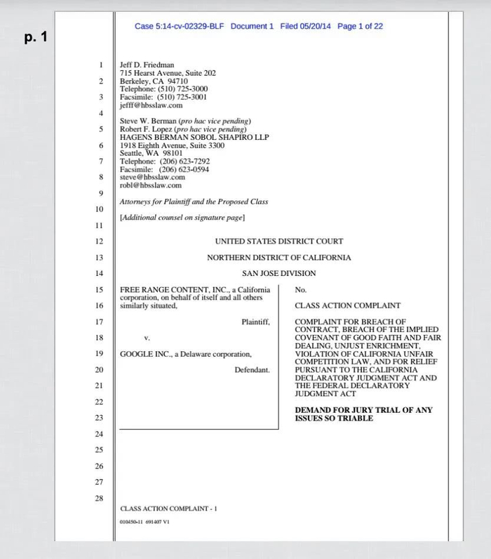 2014年5月,谷歌就曾经被以美国企业Free Range Content Inc为首的一众企业发起集体诉讼。Free Range Content Inc是Google AdSense广告发布商,被谷歌终止AdSense发布商协议的同时,扣除了AdSense账户中所有未支付的金额。