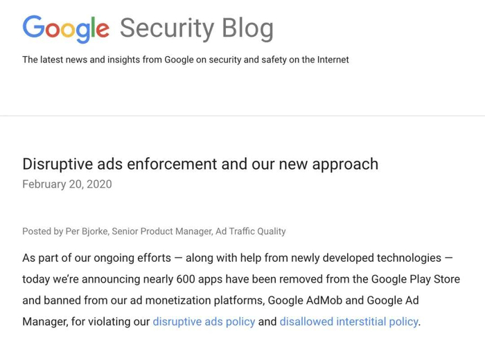 以存在App外广告等干扰性广告问题为由移除了近600款安卓应用,并禁止其开发者进入Play软件商店及其广告联盟服务。