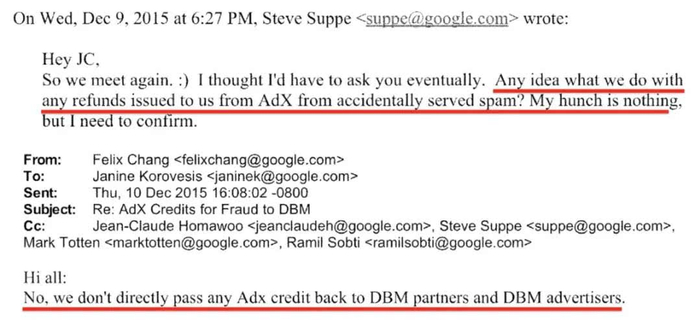 在这个案件中,令业界较为震惊的是流出的大量内部邮件证据证实了,谷歌确实没有在第一时间妥善处理因封停发布商广告而罚没的款项,并没有按销售人员所承诺的那样及时将这些款项返还到广告主手中。