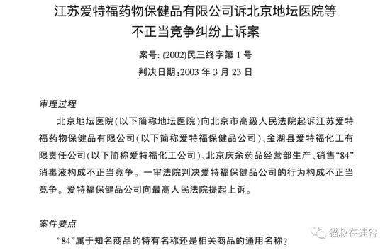 不过,84消毒液的商标早就不专属于地坛医院,最高人民法院在2003年的诉讼案中认定,84已经成为消毒剂行业普遍认可的通用商品名称,不能为一家所独占使用。