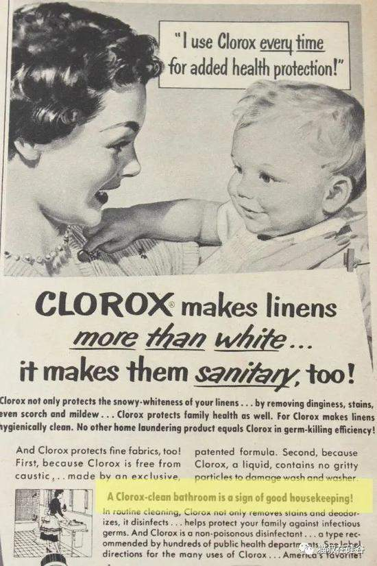 在84消毒液诞生之前70年,美国家用日化巨头高乐氏(Clorox)在1913年就推出了次氯酸钠为主要成分的溶液Clorox漂白剂,生产方式还是以氯气和氢氧化钠反应。当时五名创始人投资了500美元,在旧金山湾区的奥克兰建造了美国第一座大规模生产漂白剂的工厂,生产的漂白剂产品就叫Clorox,用于家庭的漂白、杀菌、清洁和消毒。这款产品迅速获得了成功,以至于这家公司干脆改名成了Clorox。