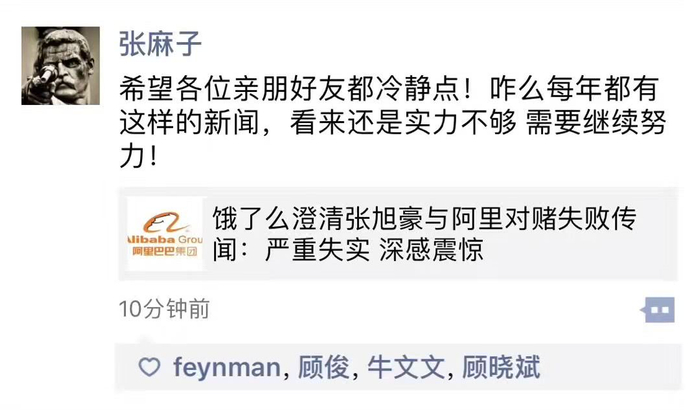 2016年12月底,有媒体报道称,饿了么创始人兼CEO张旭豪与阿里对赌失败,张旭豪或将离开饿了么,阿里将全面接管饿了么。对此,饿了么回应称,饿了么与阿里之间无“对赌”一说,从未与任何公司谈及收购之事,饿了么的独立发展一直得到阿里的大力支持。饿了么整体运行良好,不存在报道中所谓的危机。
