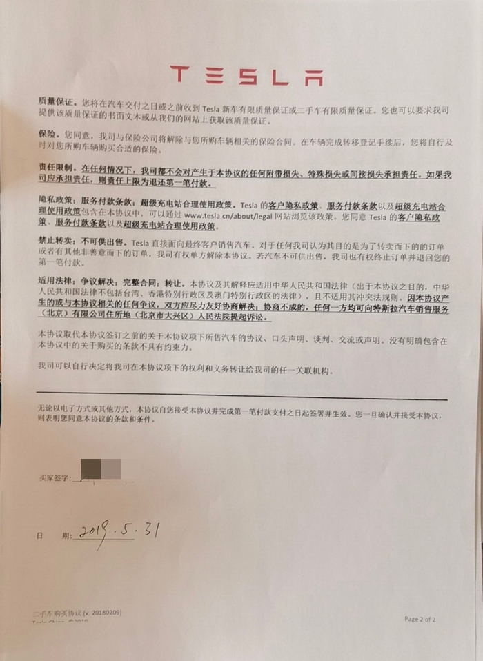 根据双方签署的合同显示,特斯拉规定,“在任何情况下,我司都不会对产生于本协议的任何附带损失、特殊损失或间接损失承担责任,如我司应承担责任,则责任上限为退还第一笔付款。”这意味着,此刻若要退车,韩先生只能收到第一笔付款10万元。