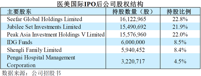 根据医美国际的股权结构显示,目前安达富资本和IDG均为鹏爱医疗的主要股东。IPO后,安达富资本通过Peak Asia Investment Holdings V Limited持有公司15,576,960股股份,持股比例为22.0%;IDG资本持有鹏爱医疗600万股,持股比例为8.5%。