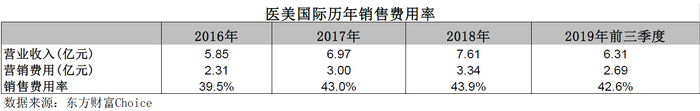 为增强品牌知名度和配合市场扩张战略,医美国际通过各种广告媒体平台增加品牌广告投放,导致公司的广告和营销费用一直居高不下。财报显示,2016-2019年前三季度,医美国际的广告和营销费用分别为2.31亿元、3.00亿元、3.34亿元和2.69亿元,占同期收入的比例分别高达39.5%、43.0%、43.9%和42.6%。