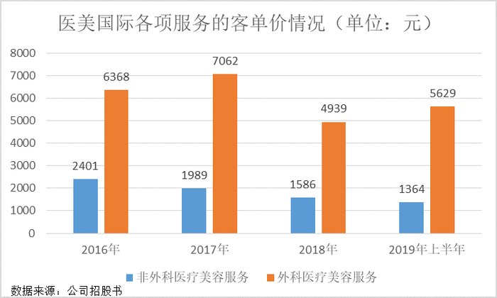 激烈的竞争同样导致公司客单价近些年连续下滑。2016-2019年上半年,非外科美容医疗服务的客单价从2401元下降至1364元,降幅达43%;2016-2019年上半年,外科医疗美容服务的客单价从6368元下降至5629元,降幅达12%。