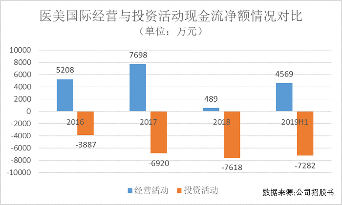 大肆扩张下,医美国际的投资活动净现金流量净额逐年增加。财报显示,2016-2019年上半年,医美国际投资活动产生的净现金流量净额分别为-3887万元,-6920万元,-7618万元和-7282万元。公司披露主要是由于企业为扩张而购买的物业、厂房及设备以及收购线下治疗中心和投资联营公司。