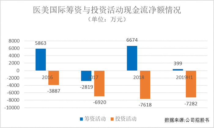 财报显示,2016-2019年上半年,医美国际的筹资活动现金流量净额分别为:5863万元、-2819万元、6674万元和399万元。公司需要依靠源源不断的外部融资来填补大幅扩张造成的财务缺口。