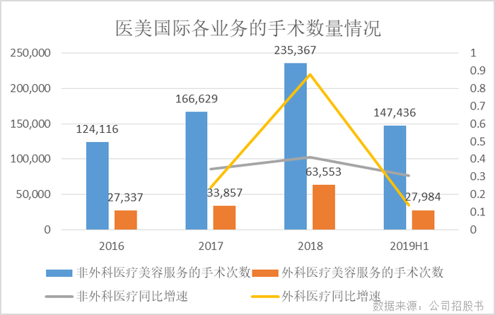 2019年上半年,医美国际共进行了147436次非外科美容医疗服务和27984次外科医疗美容服务,同比增幅分别为30.59%和 14.08%,较2018年的增速有所下滑。