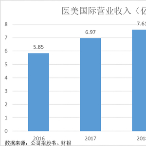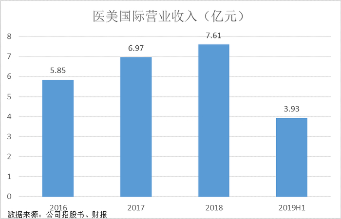 招股书介绍,医美国际主要通过提供(i)外科美容治疗,例如眼科手术,隆鼻,隆胸和吸脂,(ii)非外科美容治疗,包括微创治疗和基于能量的治疗;以及(iii)非核心业务的一般保健服务和其他美容医疗服务产生收入。财报显示,过去几年医美国际的营收一直在增长。2016-2019年上半年,医美国际的收入分别为5.85亿元、6.97亿元、7.61亿元和3.93亿元,对应的同比涨幅分别为19.1%、9.2%和10.4%。