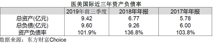 财报显示,近三年医美国际的负债始终处于高位。2017-2019年前三个季度,公司的资产负债率分别为103.8%、136.8%、101.9%,虽然经历了多轮融资,但在高速扩张之下,公司融资所筹集的资金基本都已消耗殆尽。
