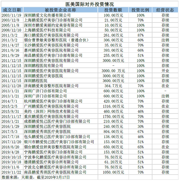 天眼查数据显示,过去17年间,深圳鹏爱医院投资管理有限公司一共对外投资了32家公司,多数以“鹏爱”品牌为名,投资额少则约10万(深圳市鹏爱美丽约定美容有限公司),多则达到3600万元(深圳鹏程医院)。