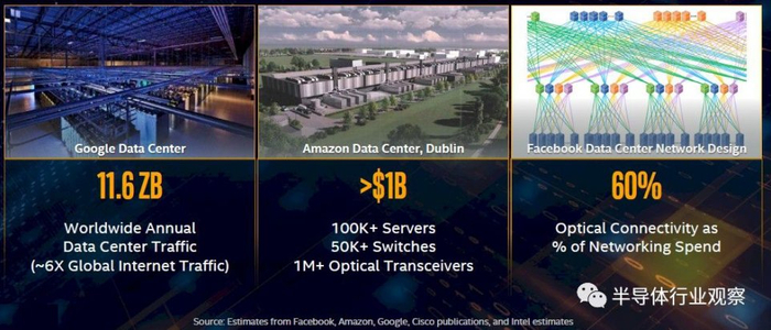 但在Hou看来,自从他在英特尔从事硅光子技术业务以来,他所关心的是,这些超大规模数据中心之一需要超过100万个光收发器,这些光收发器并不便宜。占了数据中心基础架构不小成本。统计显示,将节点连接到交换机和交换机之间的光纤线末端的光收发器在超大规模数据中心上的花费在1.5亿美元至2.5亿美元之间,然后将它们运营的所有数据中心加起来,这实际上开始每年每年仅在光收发器上的花费就增加了数十亿美元。顺便说一下,这些光收发器约占这些数据中心整体网络预算的60%,超过交换机,NIC和电缆等设备的总和。