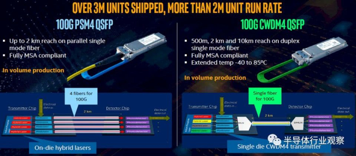 为了解决以上问题,英特尔从二十多年前就开始进行硅光子学研究,直到2016年,公司才将其第一批硅光子光学收发器投入使用,并一直在悄然提高产量。到2018年底,它已经出货了第一百万台,到2019年底,它已经卖出了300万台,仅在2020年第一季度就计划再增加50万台,保持每年200万台的速度。以下是英特尔生产的两种不同的硅光子光学收发器: