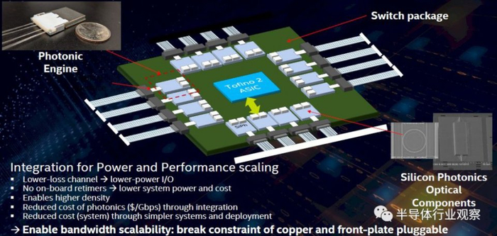 大约八个月前,在Barefoot Networks被收购之后,英特尔连通性部门的交换机和硅光子学人员开始这样做,使用“ Tofino 2”交换机ASIC在交换机上测试了这一想法,这个chiplet设计的芯片总带宽为12.8 Tb / sec。而Tofino 2芯片被共同封装的100 Gb / sec光学tiles所包围: