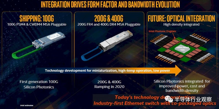 从上面的路线图中可以看出,英特尔目前正在开发其200G FR4和400G DR4光学收发器,顾名思义,它们将支持以200 Gb /秒和400 Gb /秒运行的端口。这些将在今年启动并扩大。