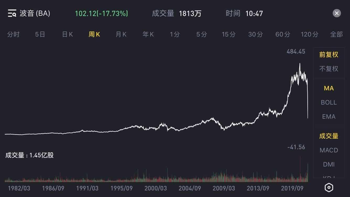 3月以来至17日,波音公司股价累计下跌54.88%,跌去千亿,总市值仅剩700亿美元(约合人民币4900亿),2019年3月波音公司股价最高达435美元,一年以来,股价则是跌去了80%。