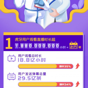 正因为此,报告期内(1月20日-3月15日),虎牙用户观看直播总时长达到18.8亿小时,约等于21万年,同比增长35%!大家刷弹幕也非常积极,同比增长34%——高达29.5亿条的弹幕想想是什么感受?比中国的人口还要多2倍多!