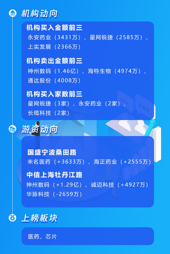 未名医药5天4板,龙虎榜显示国盛宁波桑田路主买3655万封板,东财系营业部集体助攻,买榜前5合计买入8000多万;卖榜方面,中信上海溧阳路卖出3119万位居卖一,华鑫北京菜市口大街卖出2007万,其余营业部卖出金额不大,整体上看,买卖双方金额相差不大。