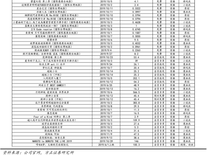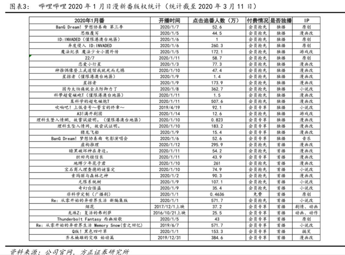 19Q4以来,B站共上新日漫番剧111部,其中独播和付费占比分别为38.7%和64.9%。2020年10月新番已公布的36部国创中,包括拥有稳固粉丝基础的《天官赐福》、《残次品》《全职高手第二季》等小说改编大IP作品。早前《天官赐福》衍生漫画作品自登陆哔哩哔哩漫画以来总计获得4,089.72万粉丝值,总榜排行第二,其相关微博话题热度高达4亿阅读量;此外,即将上线的衍生动画作品微博话题阅读量高达6亿次。2020年1月共引进35部日漫新番,其中12部为会员专享,22部为会员抢先,哔哩哔哩独播番剧19部。截至2020年3月11日,《某科学的超电磁炮T》和《Re:从零开始的异世界生活》新番追番人数超过500万人。根据官网番剧索引统计结果:20年1月上线的35部日漫番剧中,付费和独播番剧占比分别为97.1%和51.4%,较19年均呈上升趋势。
