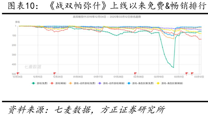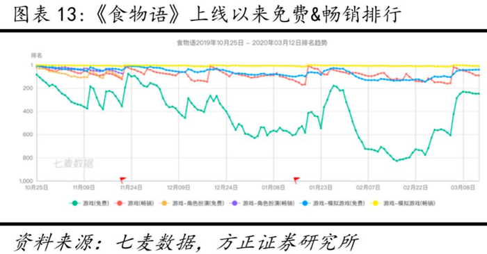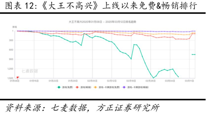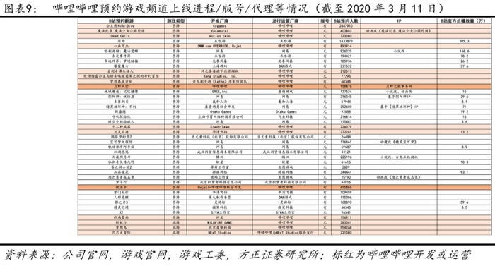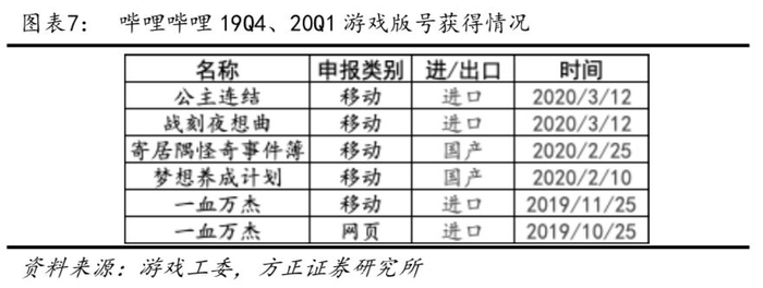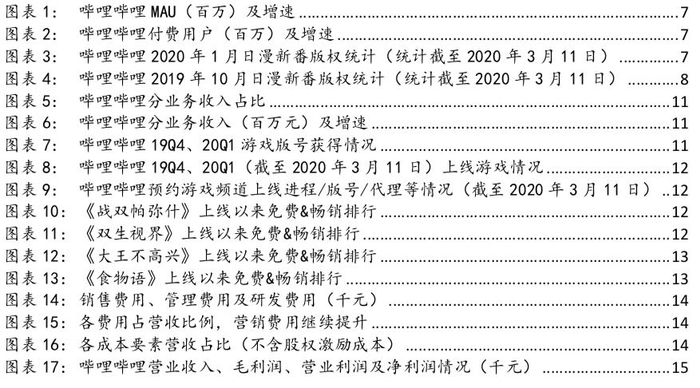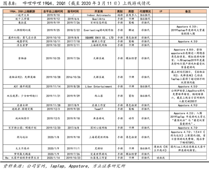自2019Q4以来,哔哩哔哩共上线18款手游,1款端游。19Q4手游方面,除去9月12日上线的《妃十三学园》,11月14日上线的《A3!满开剧团》以及上文提及的《双生视界》,10月25日,女性向RPG手游《食物语》正式公测,游戏通过打造一场中华美食的“饕餮盛宴”,登陆App Store后连续近一周稳居角色扮演类、模拟类游戏榜首,同时入围19年Taptap年度最具影响力国产游戏和最受玩家喜爱游戏。12月5日,末世科幻题材3D动作手游《战双帕弥什》上线,上线首日免费游戏榜排行第一,上线42天后首次跌出免费游戏榜前100名,入围2019TapTap 年度游戏大赏之“最佳玩法”与“最受玩家喜爱游戏”。20Q1手游方面,角色扮演类由哔哩哔哩独家代理改编自漫画《阎王不高兴》的二次元策略卡牌手游《大王不高兴》于1月9日全平台公测,游戏中加入国漫大电影《哪吒之魔童降世》角色,并以电影剧情开启副本活动,国内IOS上线后连续五天居卡牌类游戏榜首。据Sensor Tower,哔哩哔哩位列“2020 年 1 月中国手游发行商收入 Top30 | 全球 App Store+Google Play”的第 21 位,相比12月上升3个名次。收入方面环比12月增长26.5%,主要得益于《命运-冠位指定》(国服),《碧蓝航线》(国服) 等经典二次元手游在春节期间的良好表现以及新游《大王不高兴》的贡献。
