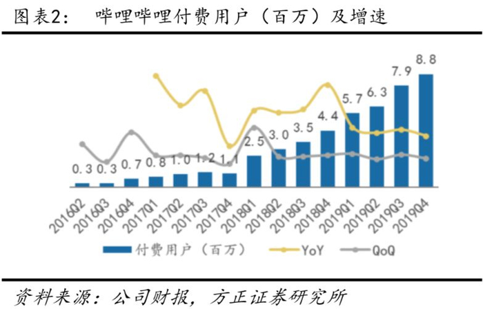 19Q4哔哩哔哩MAU达1.303亿(YoY+40%,QoQ+2%),较Q3净增加240万,移动端MAU为1.161亿(YoY+46%,QoQ+2%);DAU达到3,790万(YoY+41%,QoQ+1%),增速快于MAU,DAU/MAU为29%。19Q4付费用户数为880万(YoY+100%,QoQ+11%);正式会员数为6,800万(YoY+50%,QoQ+10%),年留存率继续保持在80%以上,日均视频观看量达7.1亿(YoY+63%),月均互动量达24亿次(YoY+141%),人均日使用时长达77分钟(除游戏时间);用户付费渗透率继续上升,Q4达6.8%,同比上升2.0pct,环比上升0.6pct,用户规模提升的同时,用户付费意愿也继续上扬。